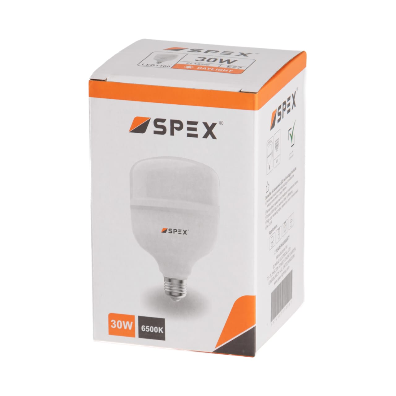 The SPEX 30W LED Bulb is a compact yet powerful lighting solution, ideal for homes, offices, shops, and small commercial spaces. With its 6500K daylight color, it provides clear and vibrant illumination. Designed with a T100 body and E27 base, it’s easy to install and offers energy efficiency and long life.